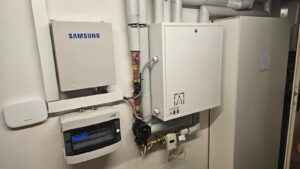 Projekt objął cztery identyczne domy szeregowe. Każda instalacja wykorzystuje kompaktowe pompy ciepła Samsung EHS Mono, integrujące ogrzewanie i przygotowanie ciepłej wody użytkowej w jednej zewnętrznej jednostce. Montaż był szybki i nieinwazyjny, bez ingerencji w przestrzeń wewnętrzną.